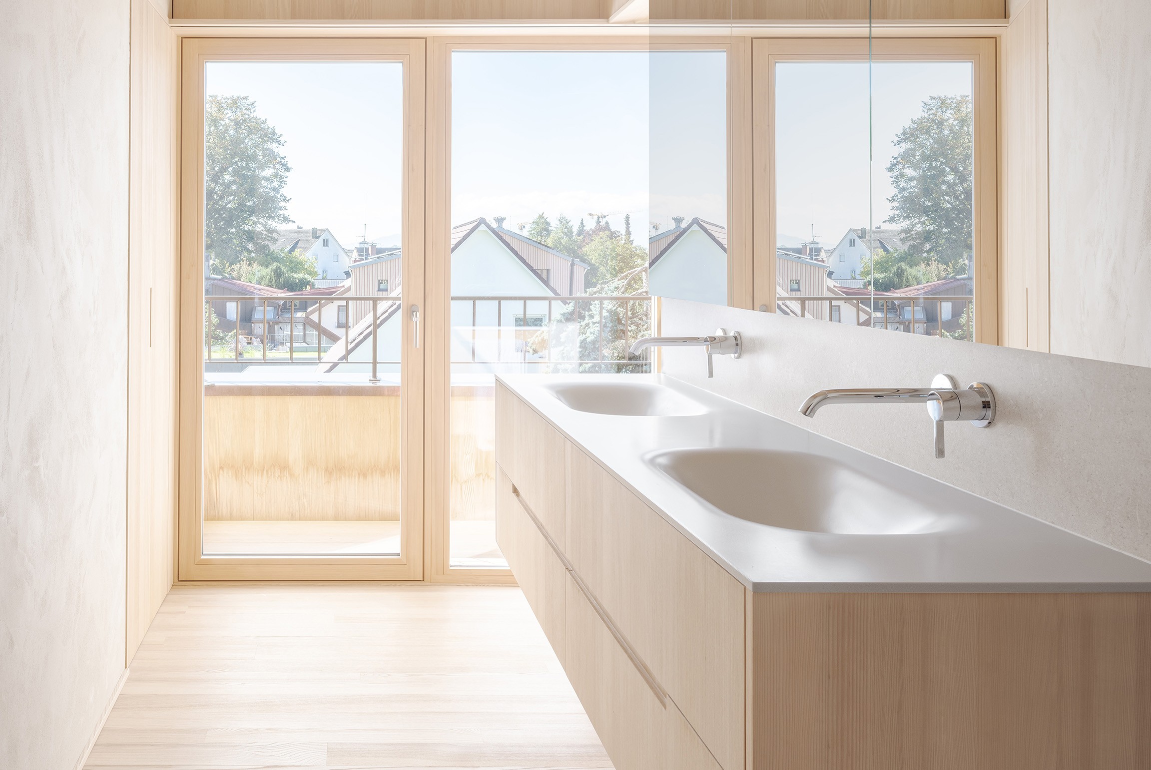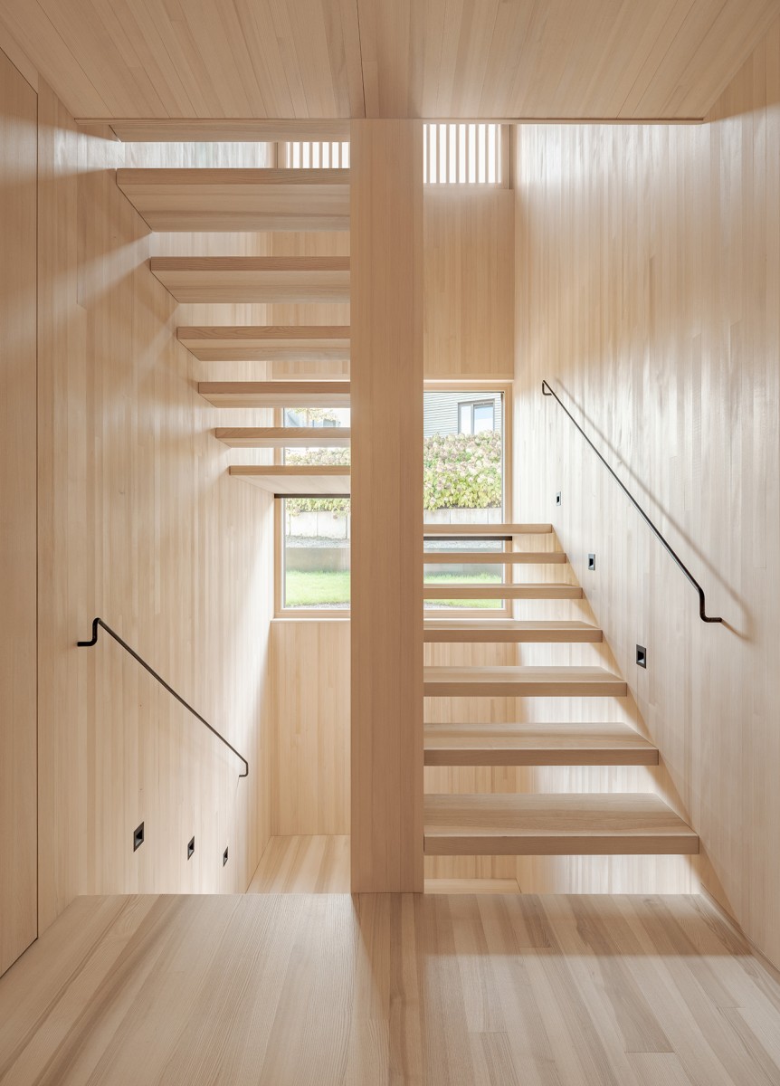 Im Innenraum kommen neben Weißtannentäfer auch Lehmplatten mit Lehmputz zum Einsatz. Diese Kombination vereint handwerkliche Qualität mit bauphysikalischen Vorteilen und verleiht den Räumen Ruhe, Wärme und Tiefe. Auch die Fenster wurden in Weißtanne ausgeführt und fügen sich selbstverständlich in das ganzheitliche Materialkonzept ein. Die Fassade ist mit naturbelassenen Holzschindeln bekleidet – eine für Lindau und Umgebung eher untypische, aber bewusst gewählte Gestaltung, die den Charakter des Holzbaus nach aussen trägt und dem Gebäude eine eigenständige, zugleich zeitlose Erscheinung verleiht.