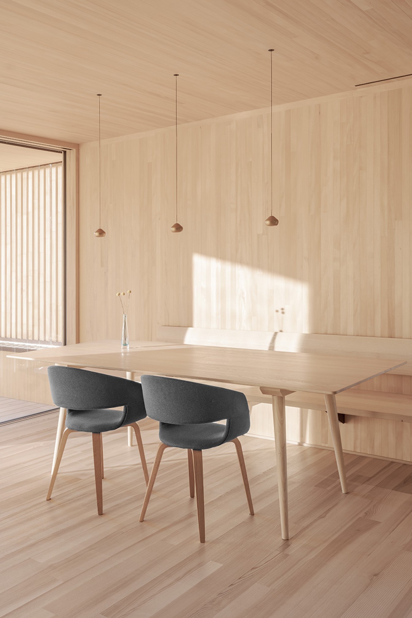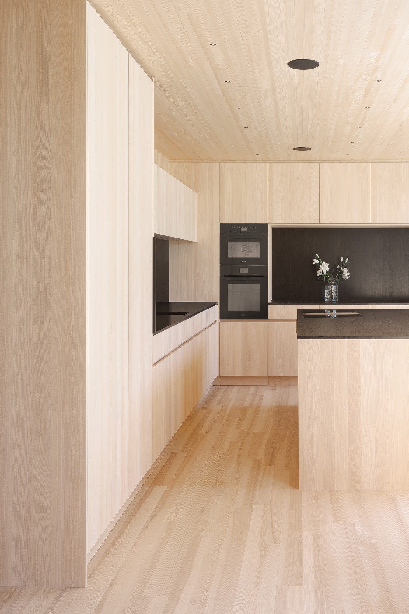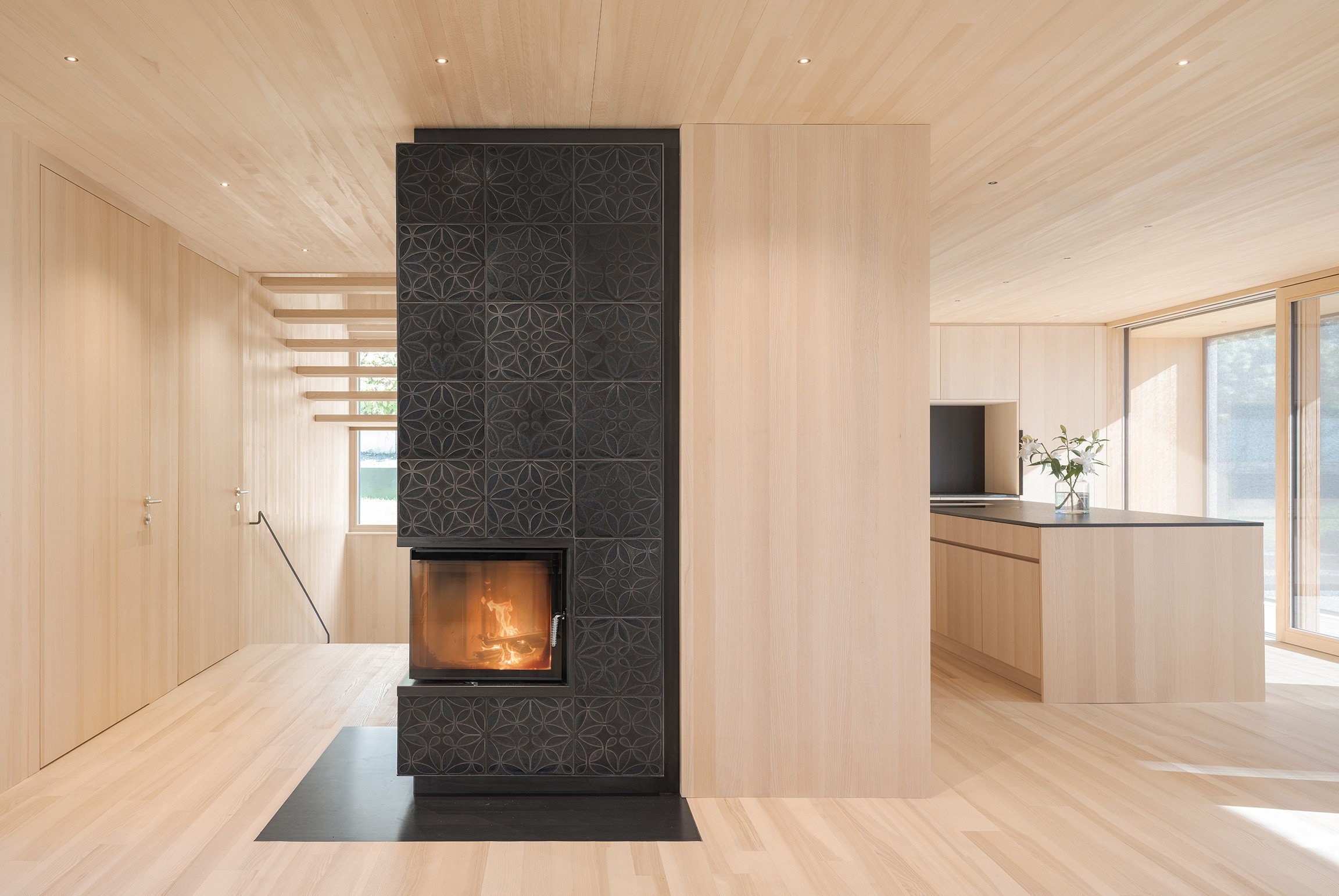 Das Gebäude basiert auf erdberührenden Bauteilen aus Stahlbeton, auf denen präzise ein Wohnhaus in Massivholzbauweise errichtet wurde. Der konsequent eingesetzte Holzbau bildet nicht nur die tragende Struktur, sondern prägt auch Atmosphäre und Erscheinung des Hauses. In Verbindung mit Lehmelementen entsteht ein diffusionsoffenes, natürlich regulierendes Raumgefüge, das ein besonders angenehmes, gesundes und heimeliges Wohnklima schafft.