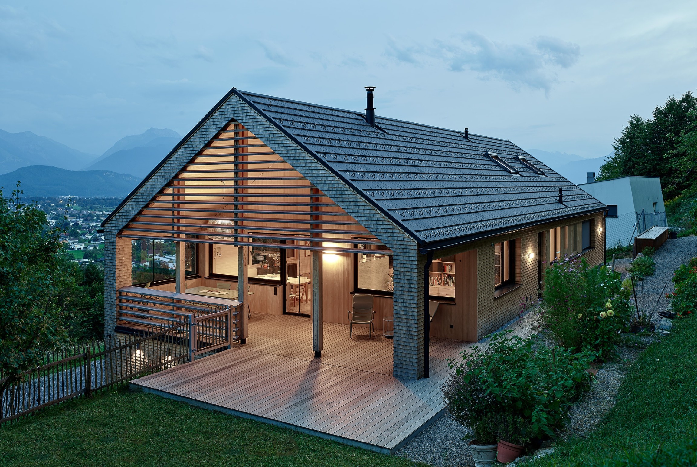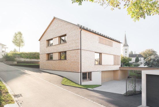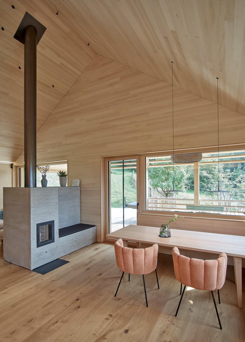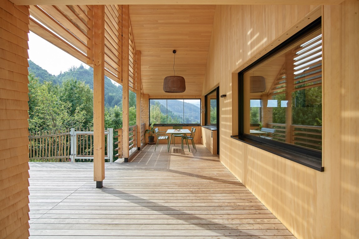 Am Waldrand über dem Reintal bettet sich das geschindelte Wohnhaus mit klaren Formen in die Landschaft ein. Nach außen zurückhaltend, entfaltet sich im Inneren eine helle, offene Wohnwelt mit starken Bezügen zum Grünraum. Natürliche Materialien wie Tannenholz und Lehm prägen die Atmosphäre und verleihen den Räumen Wärme und Tiefe. Der Wohnraum öffnet sich zur überdachten Terrasse, die giebelseitig das Gebäude mit einem horizontalen Holzfächer abschließt. Großzügige Öffnungen schaffen fließende Übergänge zwischen Innen und Außen. Das Haus verbindet zeitgemäße Architektur, handwerkliche Qualität und nachhaltige Technik zu einem Ort des Ankommens.