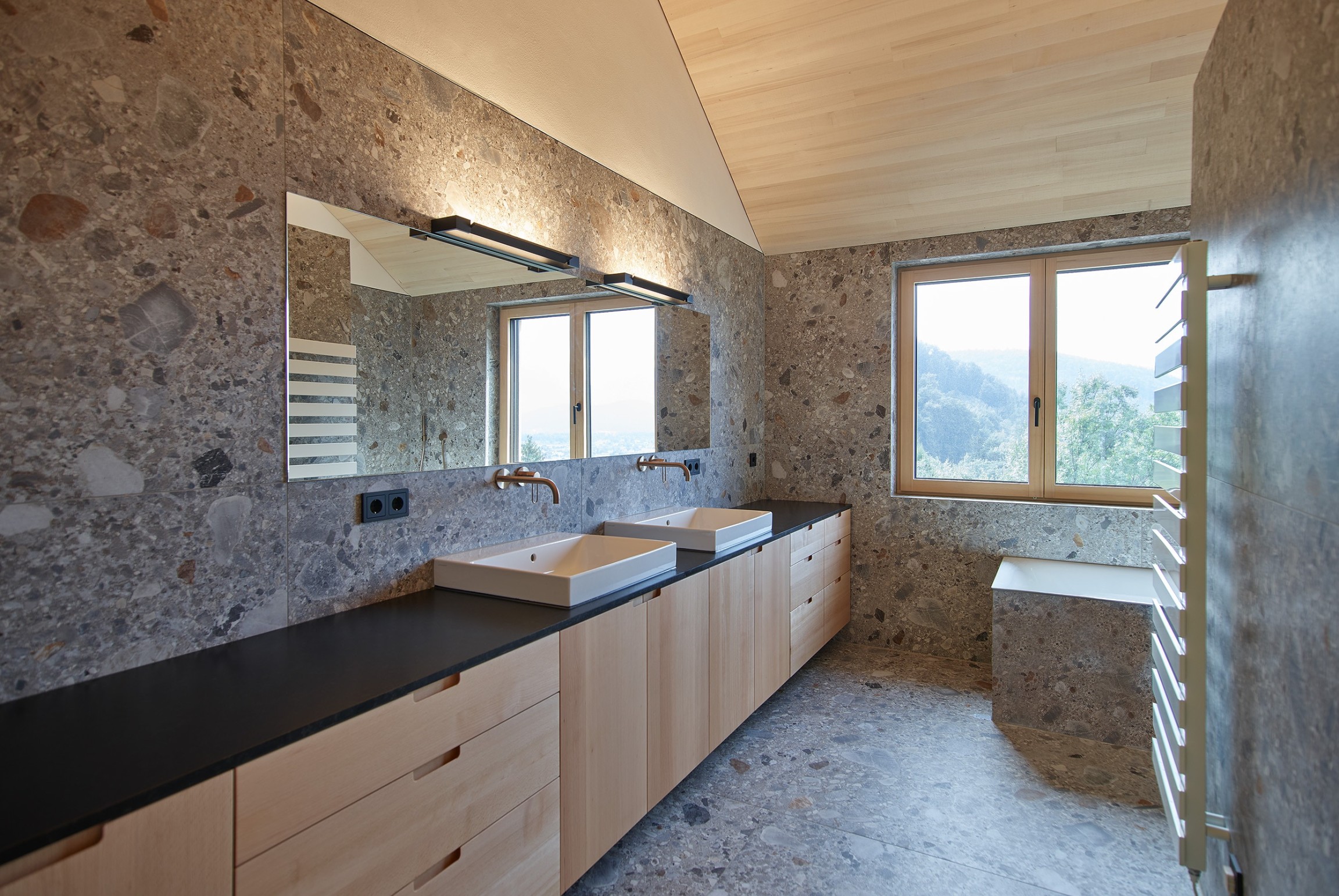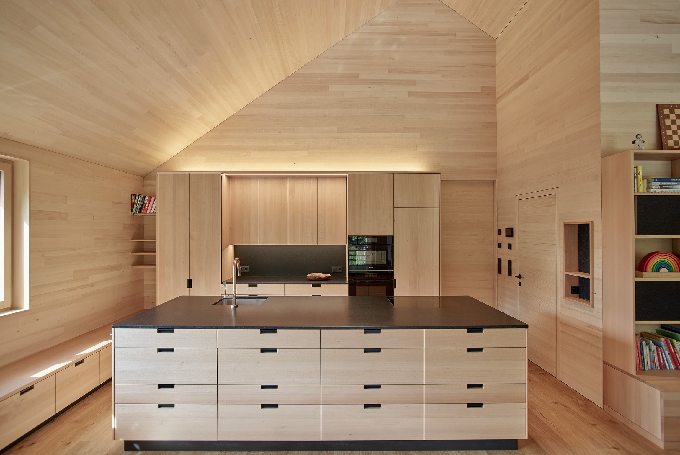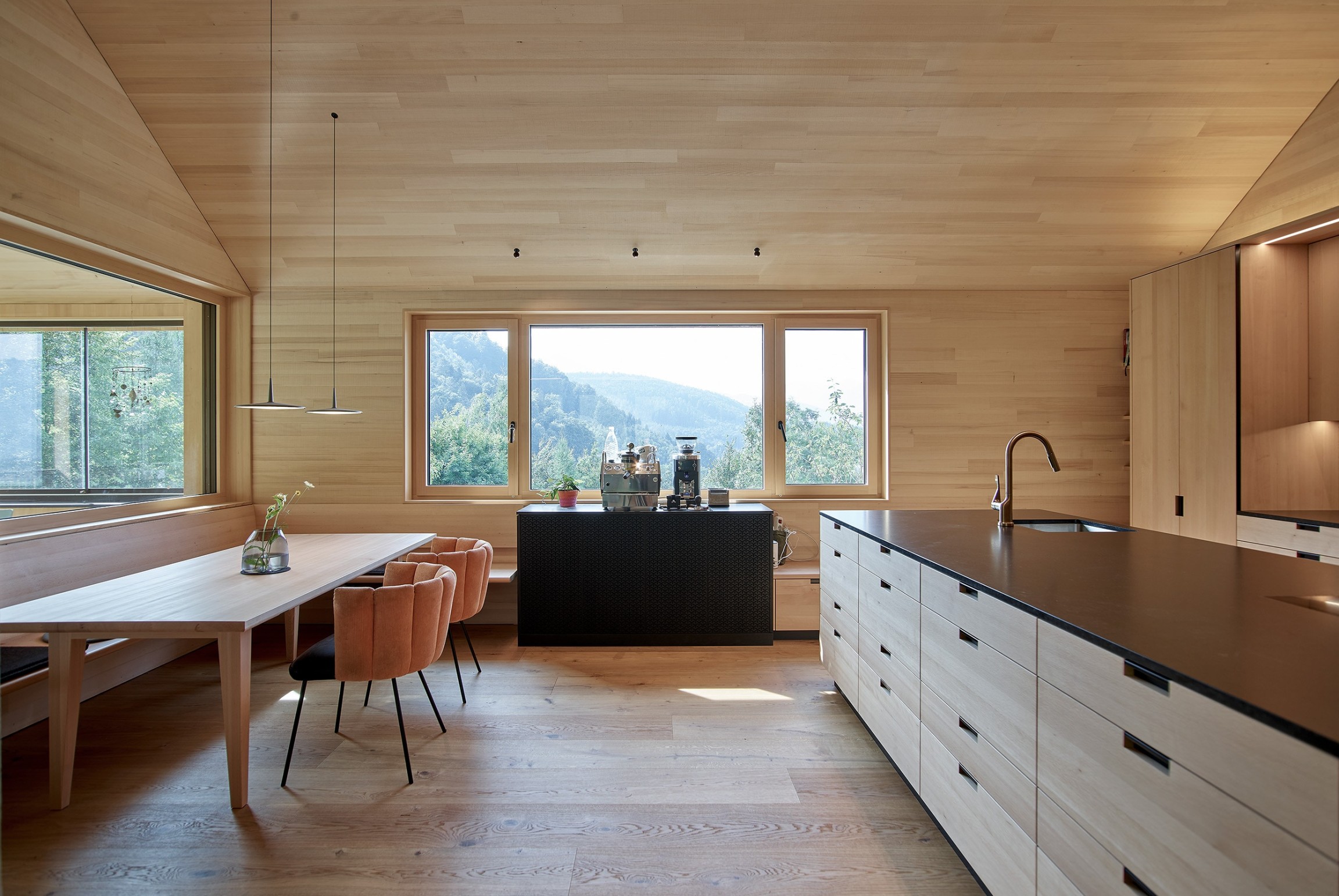 Am Waldrand über dem Reintal bettet sich das geschindelte Wohnhaus mit klaren Formen in die Landschaft ein. Nach außen zurückhaltend, entfaltet sich im Inneren eine helle, offene Wohnwelt mit starken Bezügen zum Grünraum. Natürliche Materialien wie Tannenholz und Lehm prägen die Atmosphäre und verleihen den Räumen Wärme und Tiefe. Der Wohnraum öffnet sich zur überdachten Terrasse, die giebelseitig das Gebäude mit einem horizontalen Holzfächer abschließt. Großzügige Öffnungen schaffen fließende Übergänge zwischen Innen und Außen. Das Haus verbindet zeitgemäße Architektur, handwerkliche Qualität und nachhaltige Technik zu einem Ort des Ankommens.